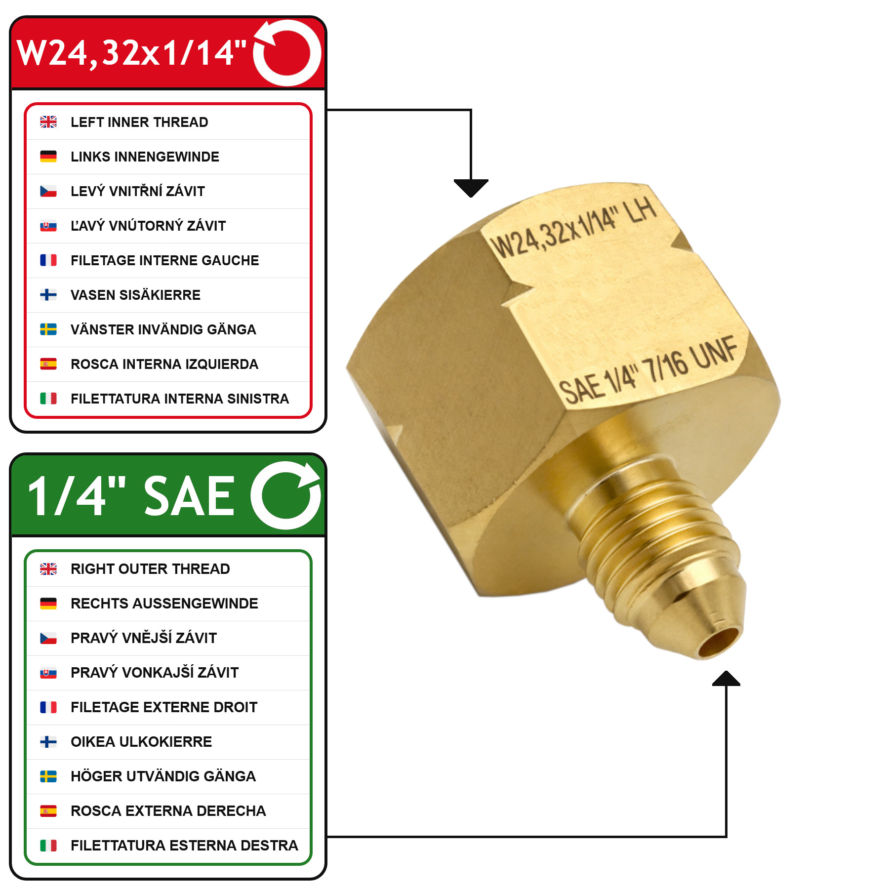 Gas adapter by Vogelmann designed to convert a W24.32x1/14 left-hand female thread to a G1/4" SAE right-hand male thread. Made of high-quality brass, ensuring durability, corrosion resistance and leak-tight connection.