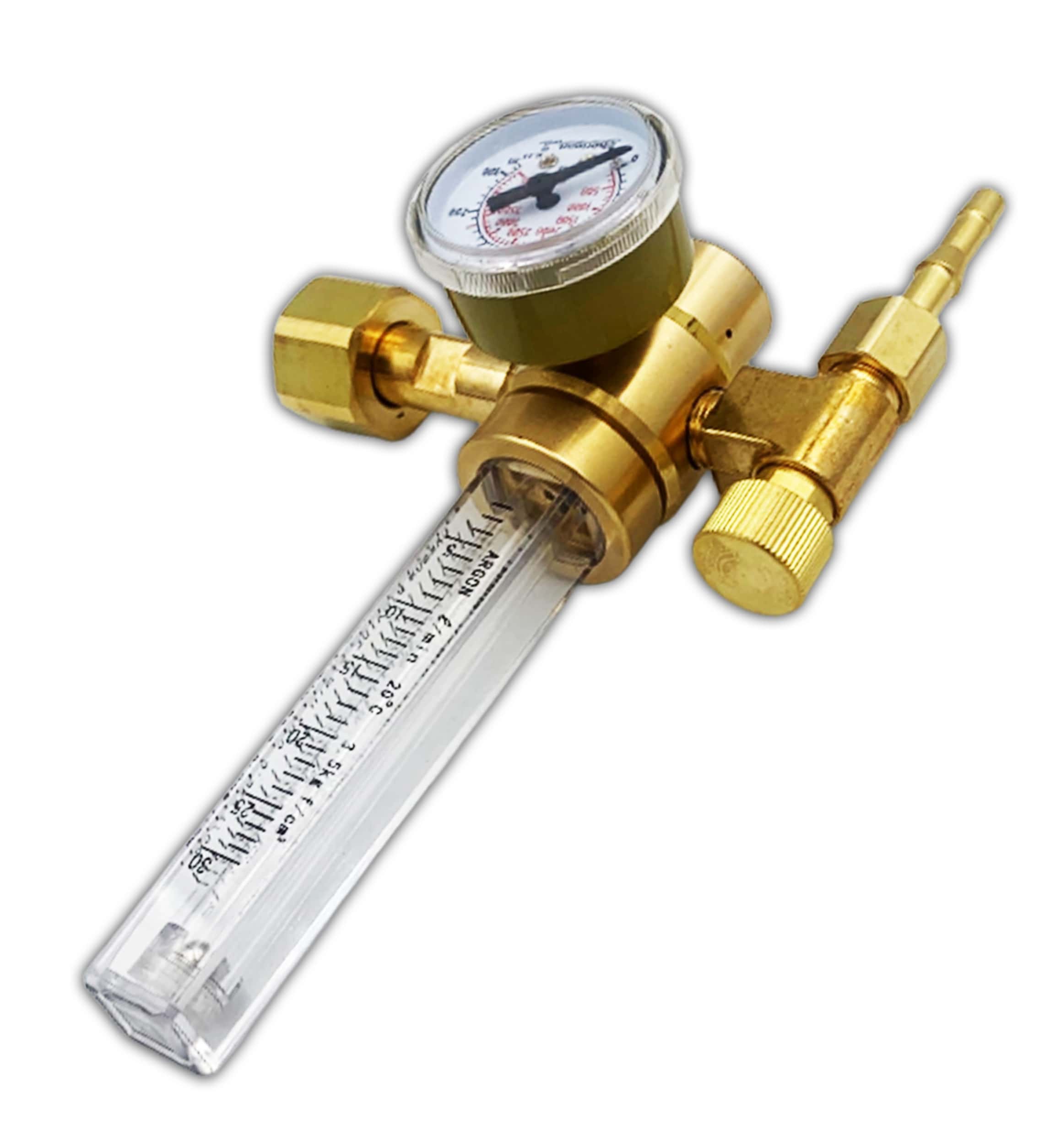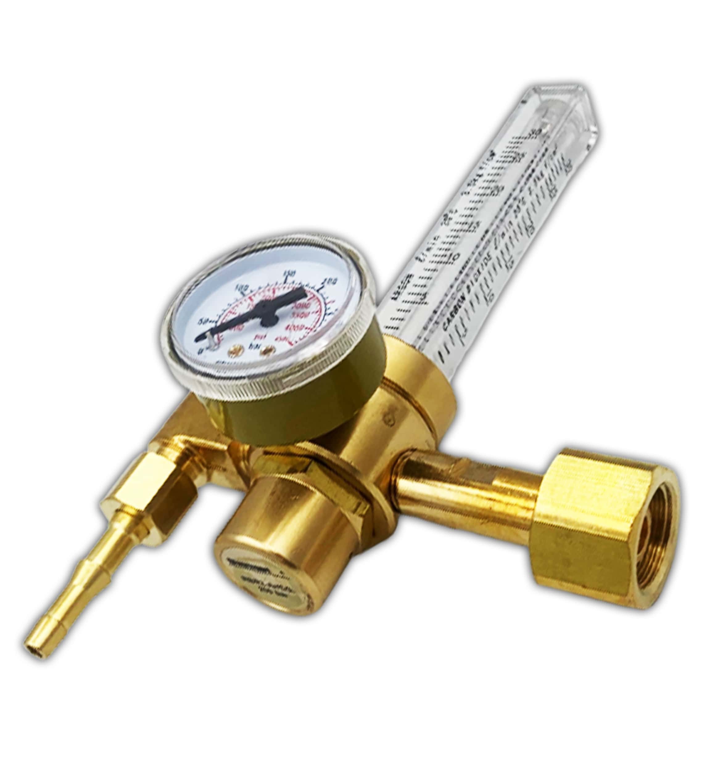 Single-stage regulator for argon, mix (Ar/CO2) and carbon dioxide with a rotametric gas flow indicator and manometric pressure gauge in the cylinder.