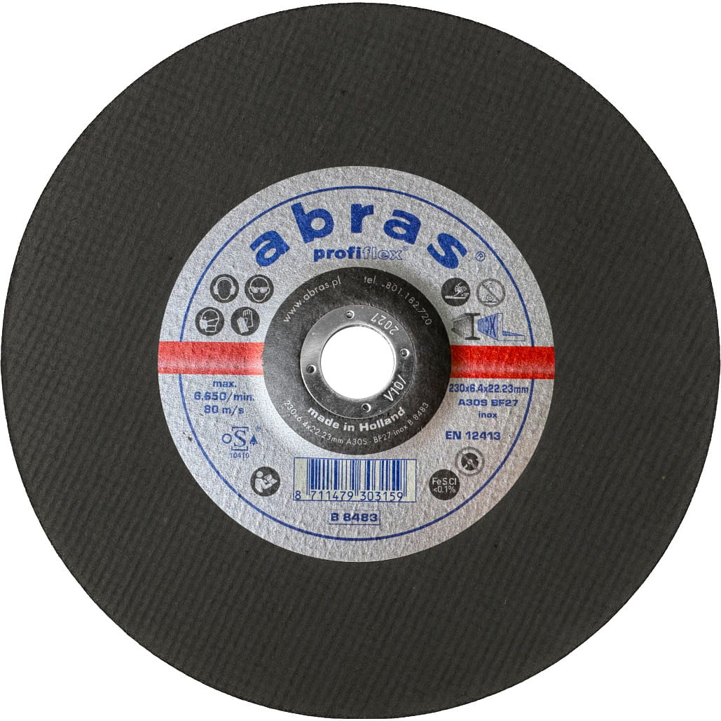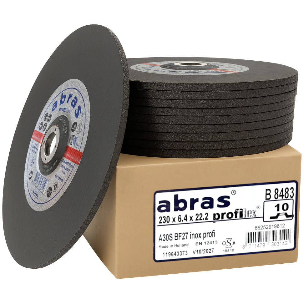 Set of 10 ABRAS grinding discs 230x6.4x22.2 A30R BF27 Inox Sprint is a professional solution for intensive industrial and workshop applications. The discs are designed for use on stainless steel (inox), carbon steel, and structural steel.