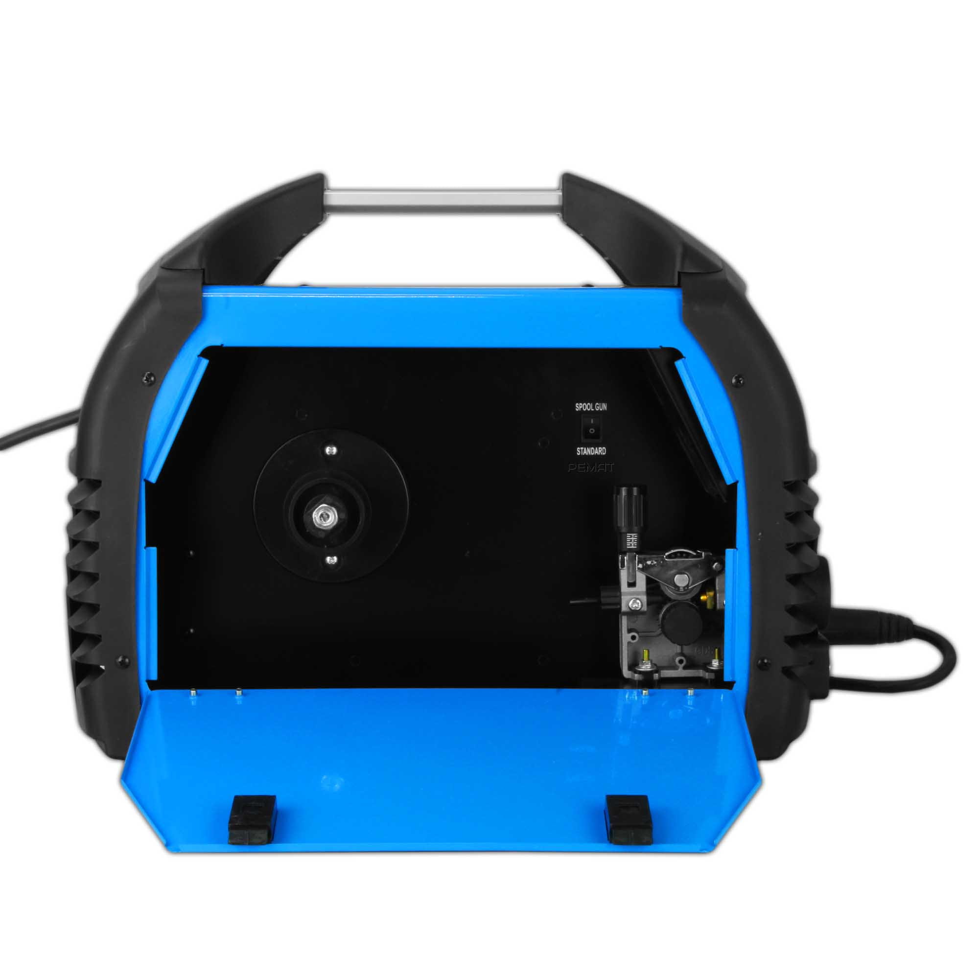 The device allows you to connect a Spool Gun (SG) with a mini wire feeder and a D100 spool of steel or colored wire.