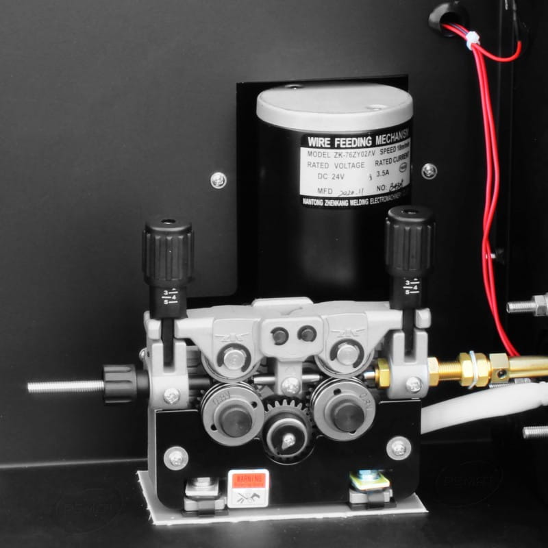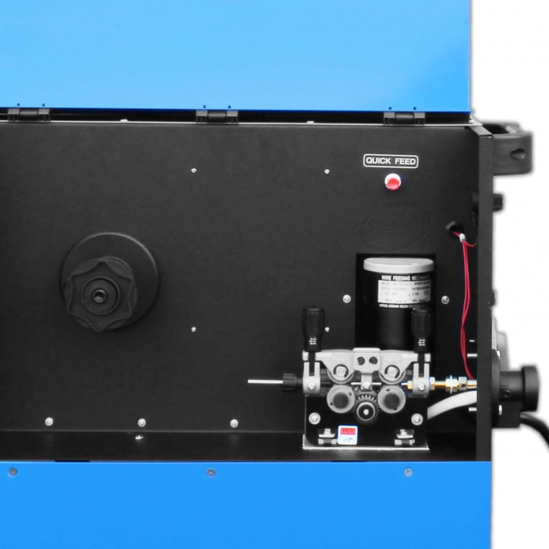 The device is equipped with a professional 4-roll wire feeder, has a smooth adjustment of the welding current and wire feed speed. The easy and quick way to change the welding voltage polarity allows you to weld with self-shielding wire without the use of protective gas.