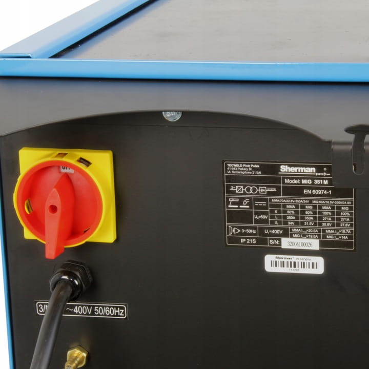 Brand: SHERMAN | Welding methods: MIG / MAG, MMA | Power supply: 400V | Welding current: 350A | Efficiency: 60%
