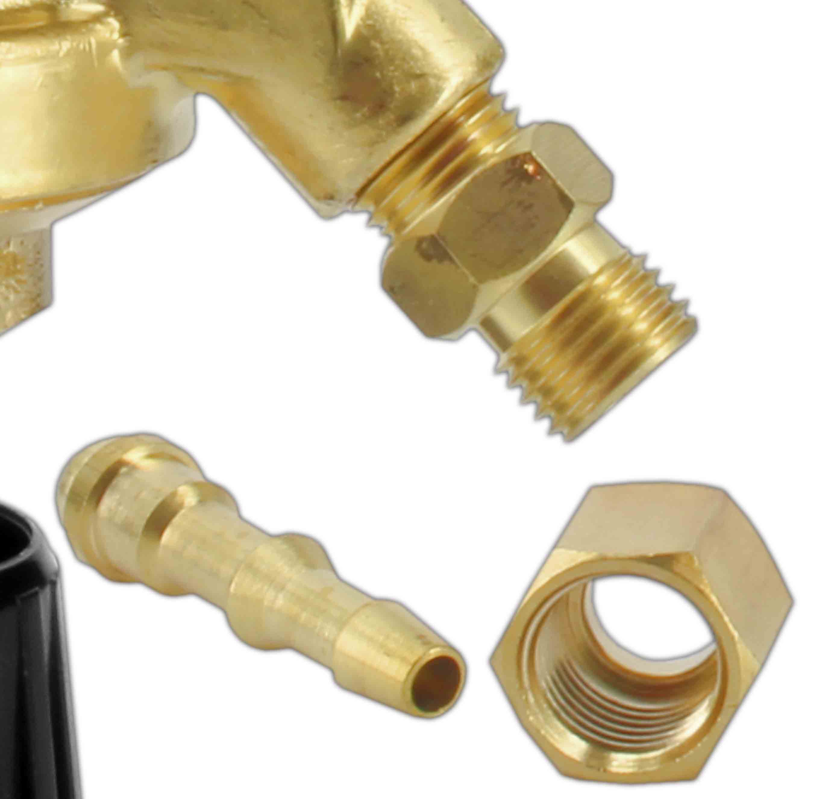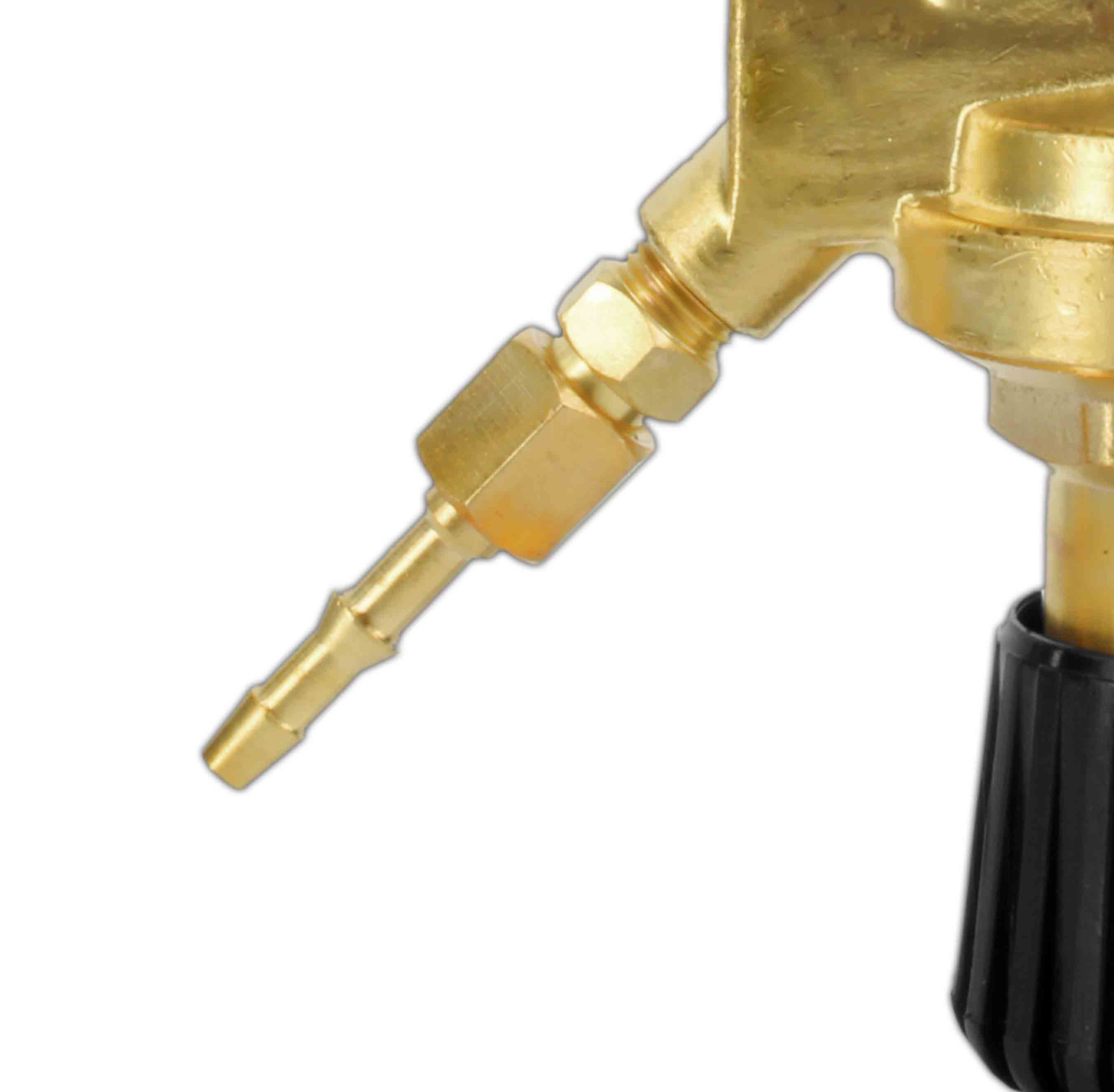 Combustible gas coupling nuts have left-hand threads and are marked with a hexagon notch. The maximum inlet and outlet pressure of the regulator are marked on the manometers with a red line.