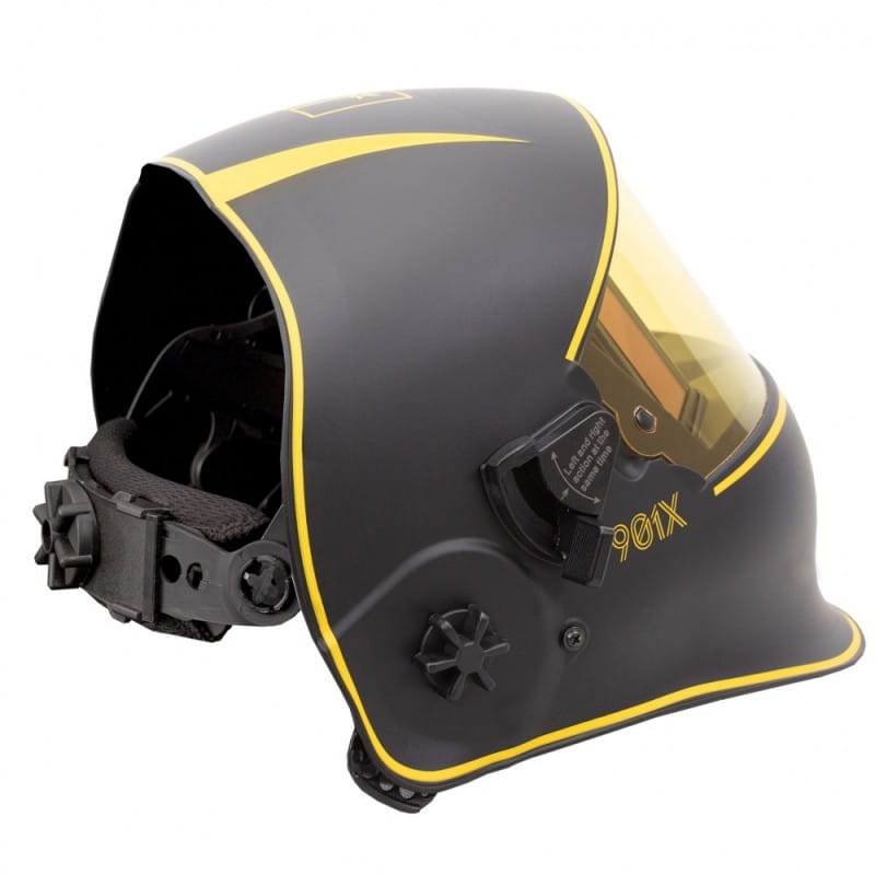 901X-kypärä on lisäksi varustettu erityisellä mekanismilla hitsaussuodattimen nostamiseen ja laskemiseen. Kun suodatin nostetaan, visiirin painopiste on alempana ja osuu pään painopisteeseen. Tämä vähentää hitsaajan niskan väsymistä ja lisää merkittävästi työskentelymukavuutta. Näkökenttä kasvaa myös – 165 x 72 mm, ja hitsaajan silmät on suojattu suojalasilla.