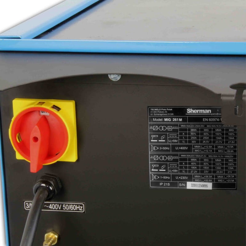 Merkki: Sherman Hitsausmenetelmät: MIG / MAG, MMA | Virtalähde: AC 230 50Hz, AC 3x400 50Hz | Hitsausvirta: 250A | Hyötysuhde: 60%