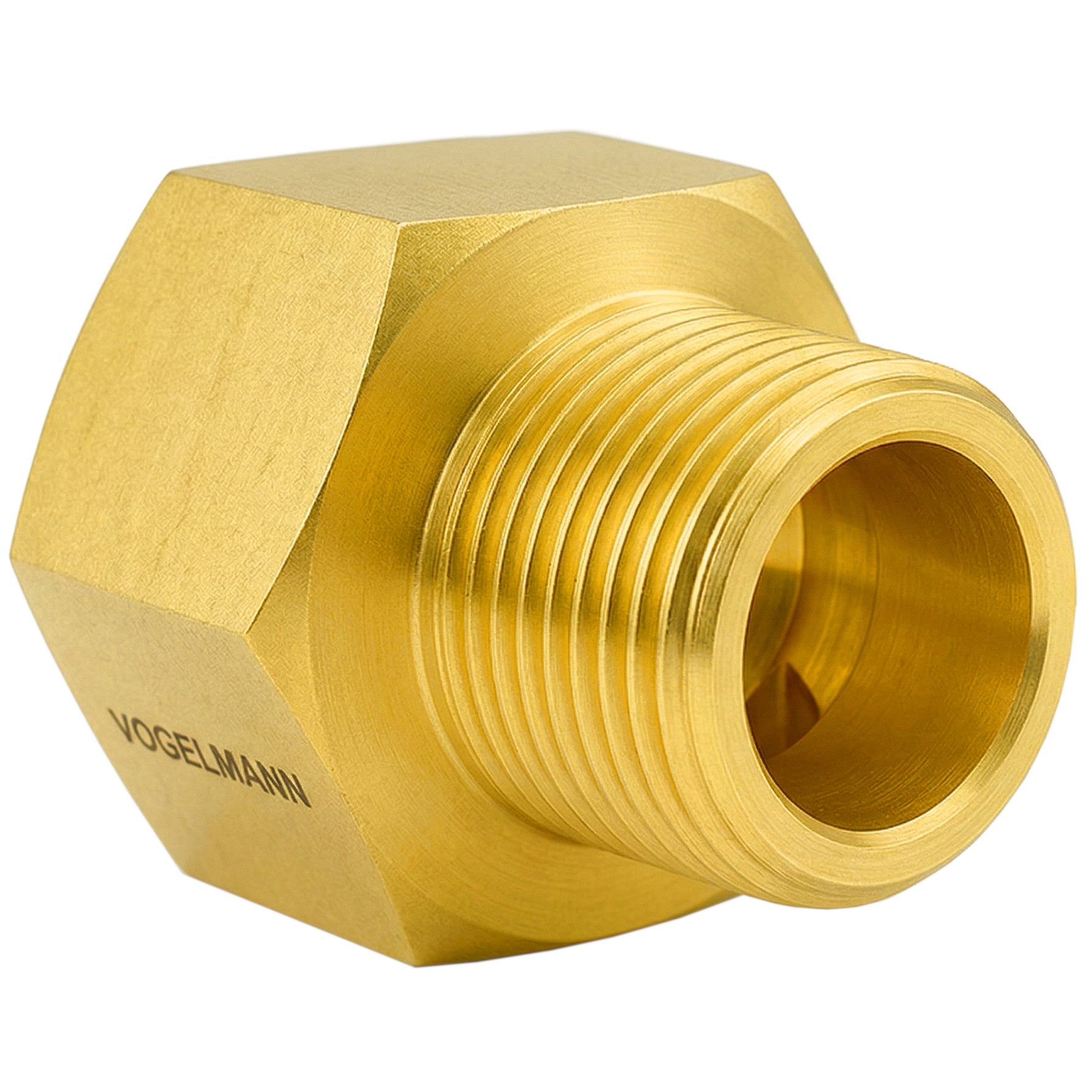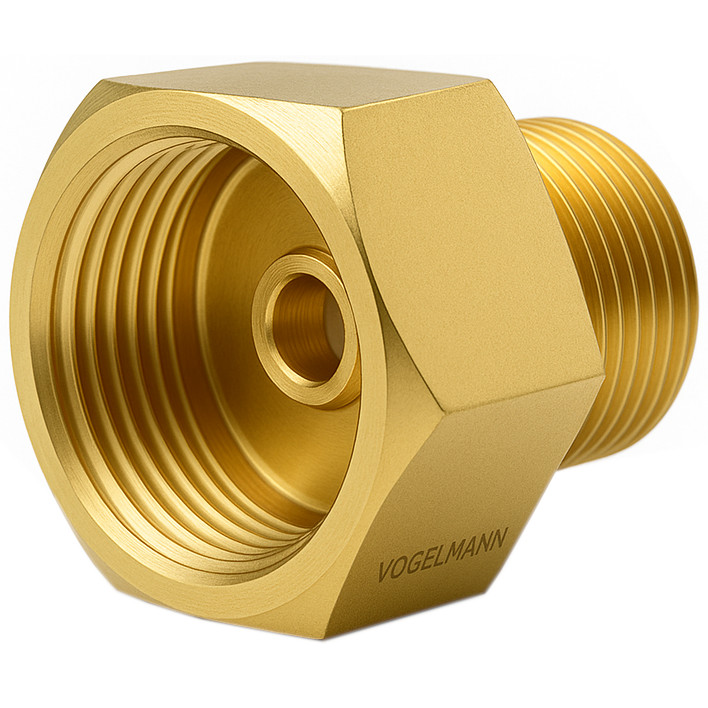 Kaasuadapteri merkiltä VOGELMANN, valmistettu kestävästä messingistä. Mahdollistaa siirtymisen G3/4"-sisäkierteestä (BSPP – tyypillinen happipulloille) W24,32x1/14"-ulkokierteeseen (DIN 477 – käytetään painesäätimissä esimerkiksi typelle).